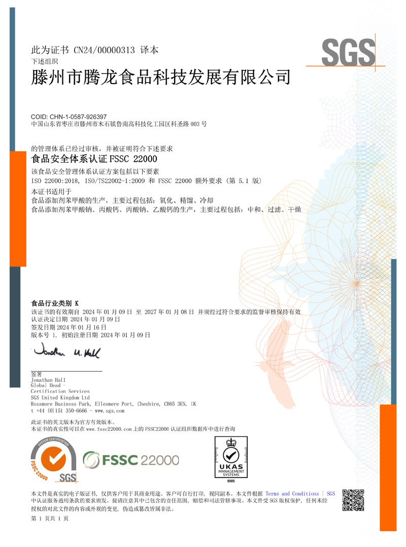 滕州市騰龍食品科技發(fā)展有限公司坐落在山東省滕州市木石鎮(zhèn)魯南高科技化工園區(qū),成立于1996年,前身是滕州市騰龍化工有限責任公司,公司專業(yè)生產 苯甲酸,苯甲酸鈉,丙酸鈣,丙酸鈉和醋酸鈣等系列產品。